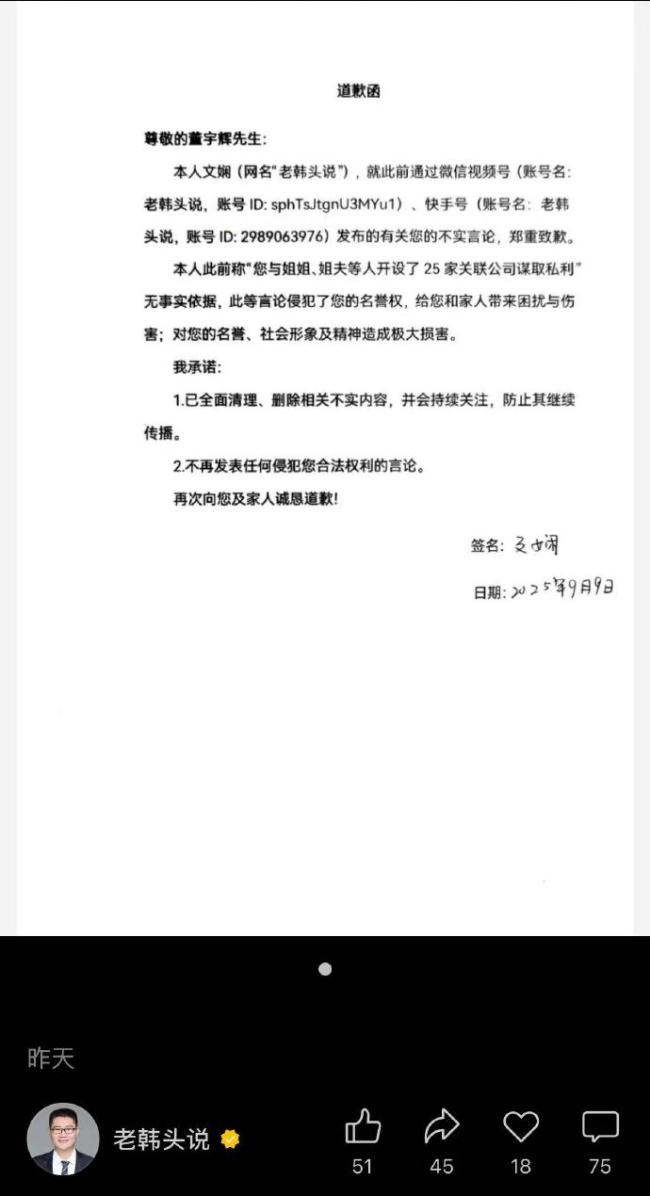 董宇辉黑粉发布致歉信,向董宇辉公开致歉 9月15日,博主“老韩头说”向董宇辉发布道歉函:本人此前称“您与姐姐、姐夫等人开设了25家关联公司谋取私利”无事实依据,此等言论侵犯了您的名誉权,给您和家人带来困扰与伤害;对您的名誉、社会形象及精神造成极大损害。本人承诺:已全面清理、删除相... 09-18