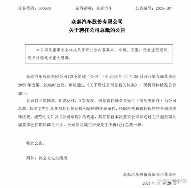 两大巨头携手重组众泰汽车 开启深度系统性变革 日前,众泰汽车发布公告,聘任韩必文为公司总裁,标志着核心高管团队任命工作完成。今年以来,众泰汽车密集推进化债行动、控股股东变更、董事会换届、偿债股票处置以及高管团队调整,实质上开启了一场深度且系统性的重组 12-03