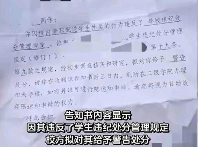 大学生兼职送外卖被处分后续 劳动自立不应被禁 重庆一名大一学生因在校内兼职送外卖,收到了学校的“违纪处分告知书”,拟给予警告处分。好在校方最终中止了处分流程,未对该学生作出实际处罚。这起事件引发热议的核心是家庭困难学生靠劳动自立是否应该被禁止 03-27