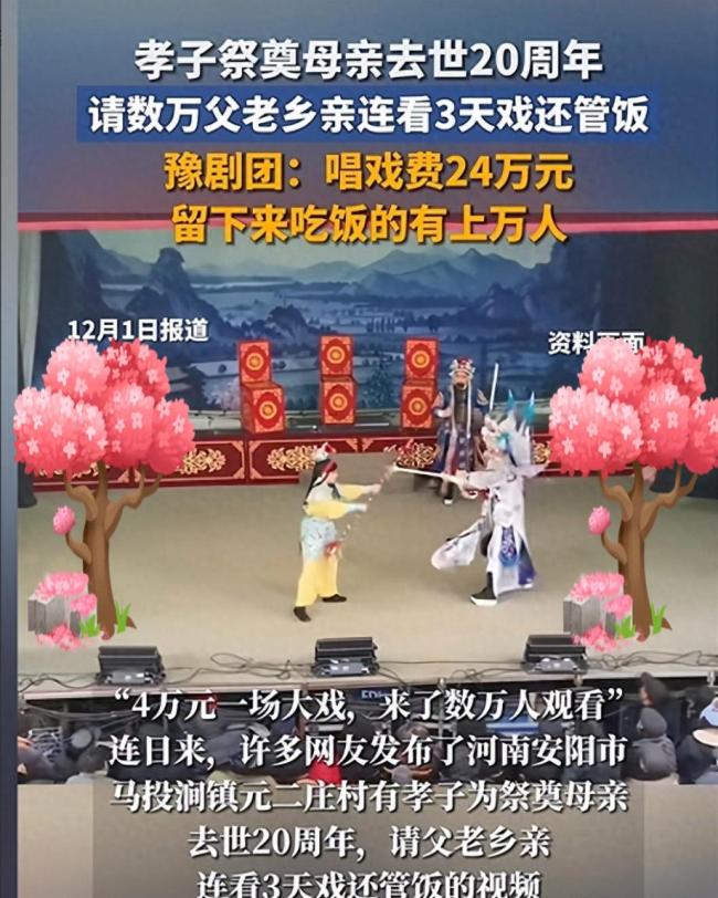 孝子祭奠母亲去世20周年请人看戏 真孝还是显摆? 孝顺是中华民族的传统美德。作为子女,如何表达对父母的爱与尊敬呢?最近,河南安阳市马投涧镇元二庄村的一位男子为祭奠去世20周年的母亲,请乡亲们免费看戏吃饭,这一举动引发了广泛讨论 12-03