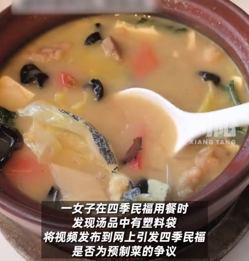 女子在四季民福汤品中吃出塑料袋 四季民福否认 9月17日,北京。一女子在四季民福用餐时发现汤品中有塑料袋,将视频发布到网上引发四季民福是否为预制菜的争议。随后,记者致电四季民福了解情况,得知其汤品中的塑料袋是当天封存蔬菜的塑料袋而非预制菜包装,四季民福员工保证称不是预制菜,如果是预制菜... 09-18