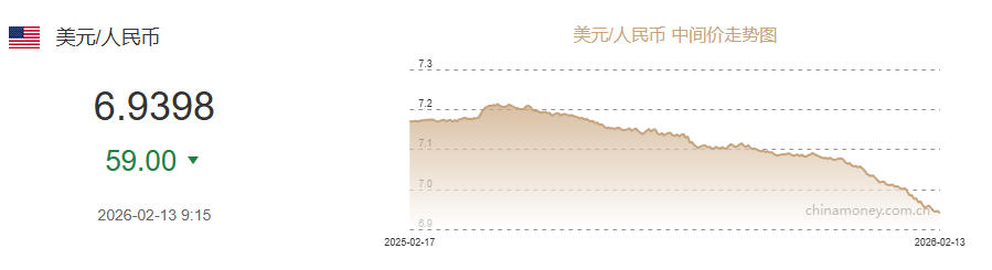 2月13日人民币对美元中间价报6.9398 上调59个基点 中新网2月13日电 据中国外汇交易中心网站消息,中国人民银行授权中国外汇交易中心公布,2026年2月13日银行间外汇市场人民币汇率中间价为:1美元对人民币6.9398元,上调59个基点。 02-13