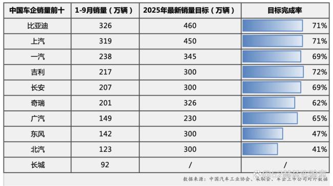 传统车企新能源目标完成率向好 销量表现亮眼 前三季度中国车企最新销量数据公布,整体行业表现稳健。根据汽车行业协会的数据,2025年前三季度汽车行业继续保持稳中向好的发展态势。比亚迪和上汽集团位居前列。比亚迪1-9月销量达到326万辆,完成全年460万辆目标的71% 10-13