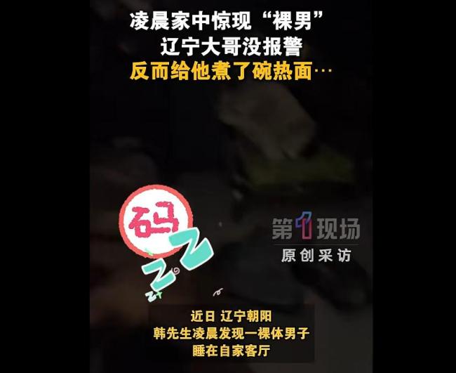 客厅半夜惊现醉酒裸男 房主收留还煮面 暖心相助零下十几度 近日,辽宁朝阳的韩先生凌晨发现一名裸体男子睡在自家客厅。经了解,这名男子因醉酒走错门,还遗失了手机和外套,当时气温低至零下十几度。韩先生看到男子尚未完全清醒,担心他会冻死,决定帮助他。韩先生不仅给男子倒水煮面,还让他留宿了一晚 11-28