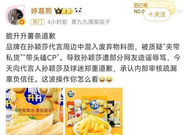 官媒批孙颖莎代言事件,网友:很失望 信任危机浮现 孙颖莎因为一包薯条陷入了舆论风波,连官媒《东方体育日报》都进行了点名,事情变得微妙起来。起因是国产薯条品牌“脆升升”邀请孙颖莎代言,但在制作周边产品时出了问题,把一些印错的废弃物料发了出去 09-23
