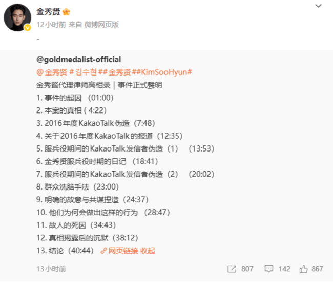 金秀贤转发律师视频声明 否认未成年交往传闻 10月28日,金秀贤的官方微博账号转发了所属经纪公司goldmedalist对金秀贤与已故女星金赛纶纠纷事件的正式声明。这是金秀贤自2020年8月在微博分享生活动态后的最新更新 10-31