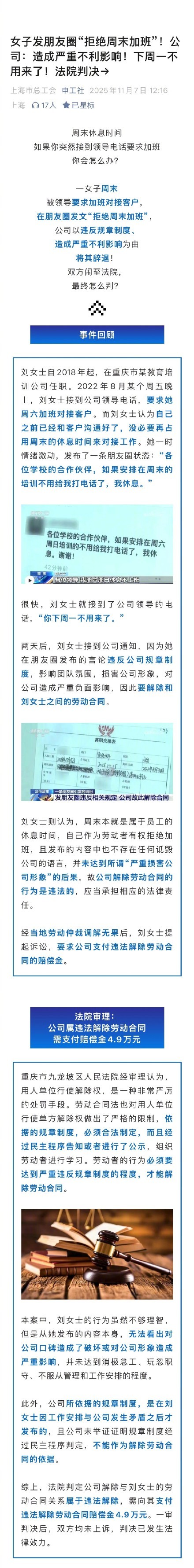 女子发朋友圈拒加班被辞获赔4.9万 法院判公司违法解除合同 一名女子因拒绝周末加班,在朋友圈发文表达不满后被公司辞退。双方最终闹至法院,事情有了结果。刘女士自2018年起在重庆市某教育培训公司工作。2022年8月的一个周五晚上,她接到领导电话要求周六加班对接客户 11-07