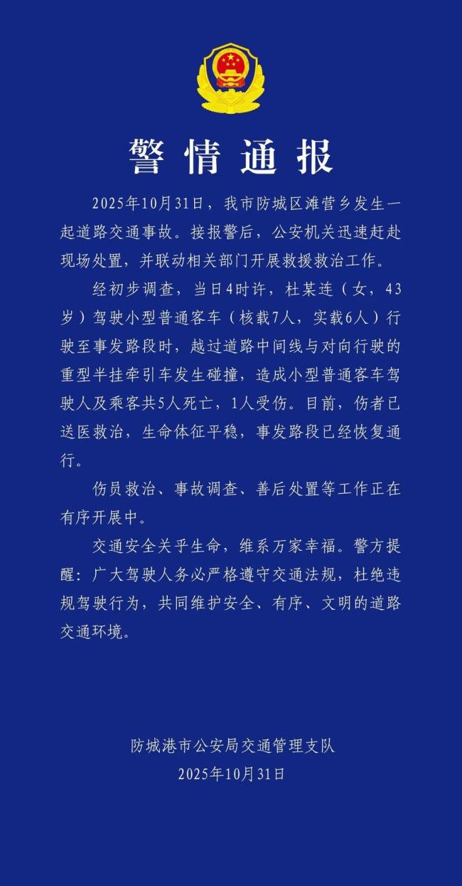 小客车与半挂车碰撞致5人死亡 事故现场已恢复通行 10月31日中午,防城港交警通报了一起道路交通事故。事故发生在防城区滩营乡。当日4时许,杜某连(女,43岁)驾驶一辆小型普通客车(核载7人,实载6人)行驶至事发路段时,越过道路中间线与对向行驶的重型半挂牵引车发生碰撞 10-31