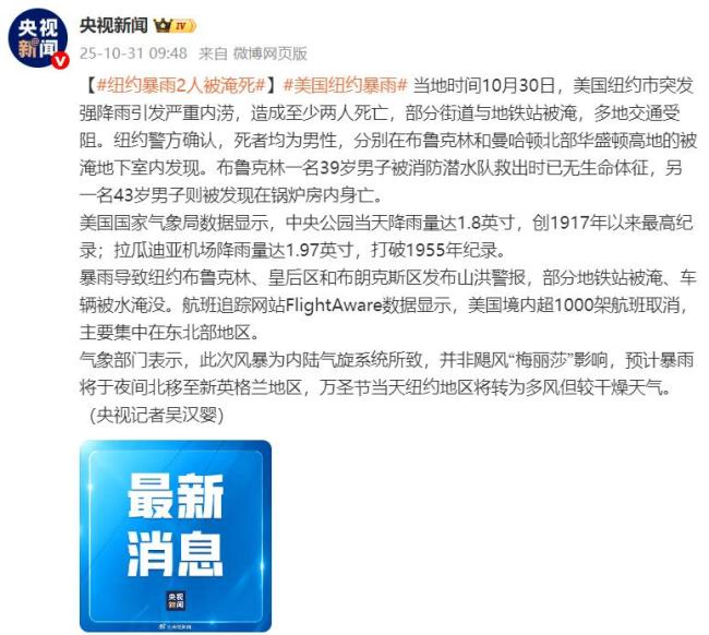 美国超1000架航班取消 暴雨引发交通瘫痪 当地时间10月30日,美国纽约市遭遇强降雨,引发严重内涝,导致至少两人死亡。部分街道与地铁站被淹,多地交通受阻。纽约警方确认,死者均为男性,分别在布鲁克林和曼哈顿北部华盛顿高地的被淹地下室内发现 10-31