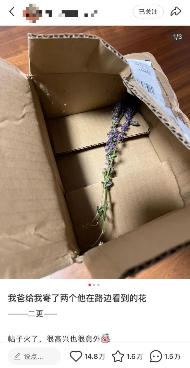 热搜:“我爸给我寄了两支路边看到的花” 笨拙的浪漫引发共鸣 近日,一名网友分享了爸爸寄来的两支野花,引发网友热议。这两朵已经变成干花的小野花孤零零地躺在快递盒里,“可怜”却又可爱。这名网友提到,自己原本并未想到这会被称作“浪漫”的事,只是觉得自家“老爹”笨拙得可爱 09-22