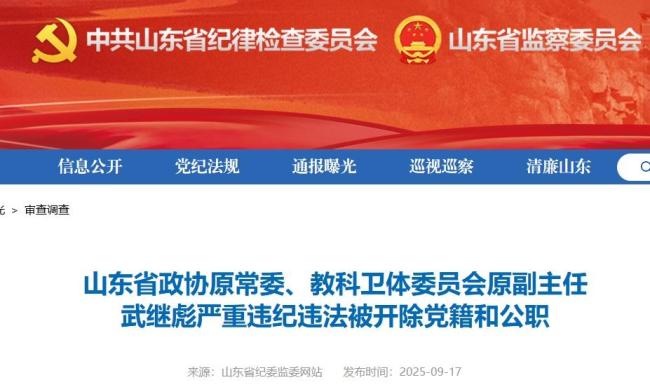 山东省政协原常委武继彪被“双开” 严重违纪违法受惩处 山东省纪委监委9月17日宣布,经山东省委批准,山东省纪委监委对山东省政协原常委、教科卫体委员会原副主任武继彪的严重违纪违法问题进行了立案审查调查 09-18