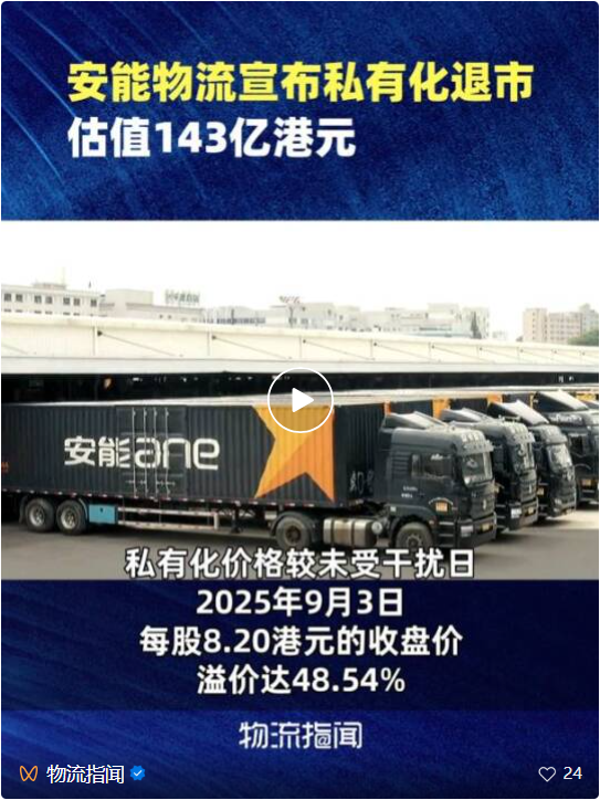 143亿港元被财团收购!安能宣布将私有化退市 10月28日,安能物流与由大钲资本、淡马锡和淡明资本共同组成的财团宣布,拟通过协议安排(“提案”)的方式,将安能物流从香港联合交易所退市。 10-31 物流指闻