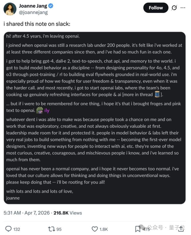 GPT-4o之母宣布离职OpenAI 告别灵魂工程师 Joanne Jang,被称为GPT-4o的灵魂工程师,宣布结束在OpenAI四年半的工作。她在一篇长文中表示,离开OpenAI后将不再解释原因或透露下一步计划 04-08