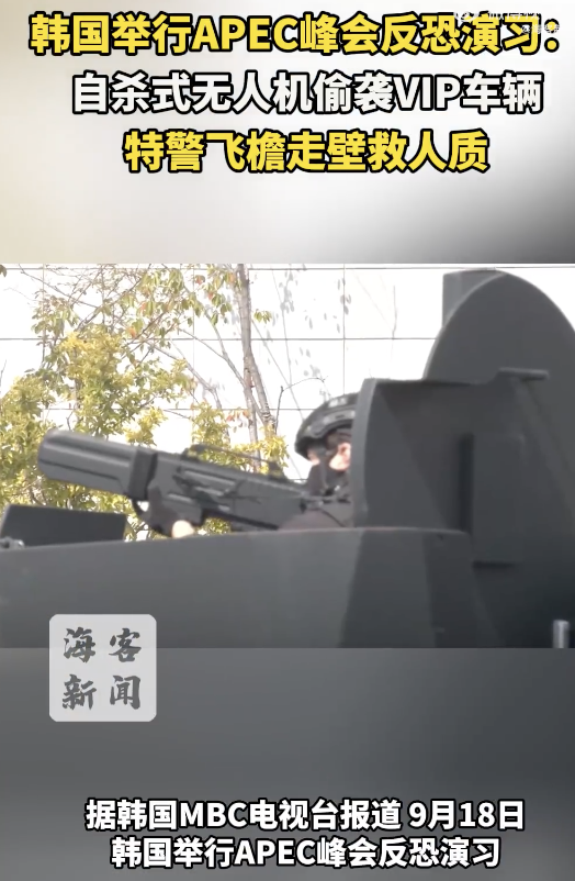 韩国APEC峰会反恐演习画面曝光! 韩国APEC峰会反恐演习画面曝光。韩国举行APEC峰会反恐演习:自杀式无人机偷袭VIP车辆特警飞檐走壁救人质。据韩国MBC电视台报道,9月18日,韩国举行APEC峰会反恐演习,演练内容包括应对自杀式无人机袭击和毒气攻击、恐怖分子清剿、人质解... 09-19
