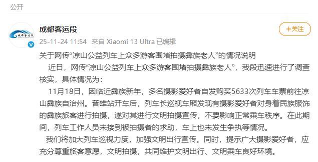 官方通报“彝族老人被围堵拍摄” 文明拍摄需尊重意愿 11月24日,成都客运段发布关于网传“凉山公益列车上众多游客围堵拍摄彝族老人”的情况说明。近日,网上传播了一则关于凉山公益列车上多名游客围堵拍摄彝族老人的消息 11-24